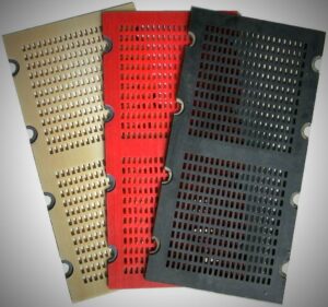 Unsere Siebmaterialien sind aus flexiblen Siebbelag-Materialien gefertigt. Mit Hilfe besonderer Stanz-Werkzeuge erzeugen wir abgerundete Lochformen. Diese Kombination reduziert die Bildung von Steckkorn, sodass das Sieb weniger oft verstopft und der Siebprozess deutlich effizienter ist. Die flache Beschaffenheit unserer Siebe verhindert zudem, dass sich faserartige Elemente so häufig festsetzen oder verklemmen wie bei Drahtsieb-Belägen.